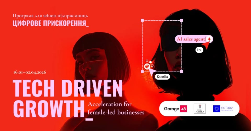 Громадська організація “Інша Жінка” спільно з Garage48 та за підтримки Естонського центру міжнародного розвитку (ESTDEV) запускають набір на акселераційну програму для українських жінок-підприємиць «Tech driven Growth», яка допомагає засновницям бізнесу на ранньому етапі масштабувати свої бізнеси за допомогою цифрових інструментів, технологій та розвитку лідерських навичок.